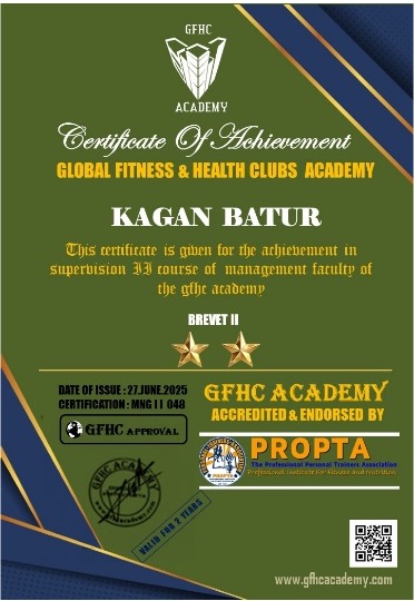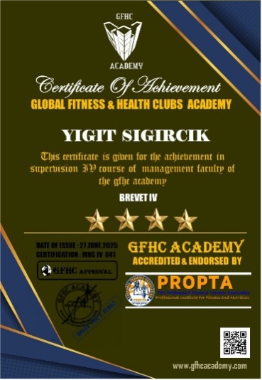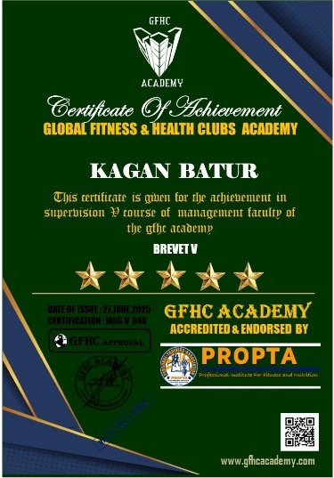 Bu eğitim SUPERVISION I / SUPERVISION II / SUPERVISION II / SUPERVISION IV / SUPERVISION V / HEALTH CLUB MANAGER / FITNESS MANAGEMENT COMPETENCY / FACULTY OF MANAGEMENT DIPLOMA belgelerini içerir.