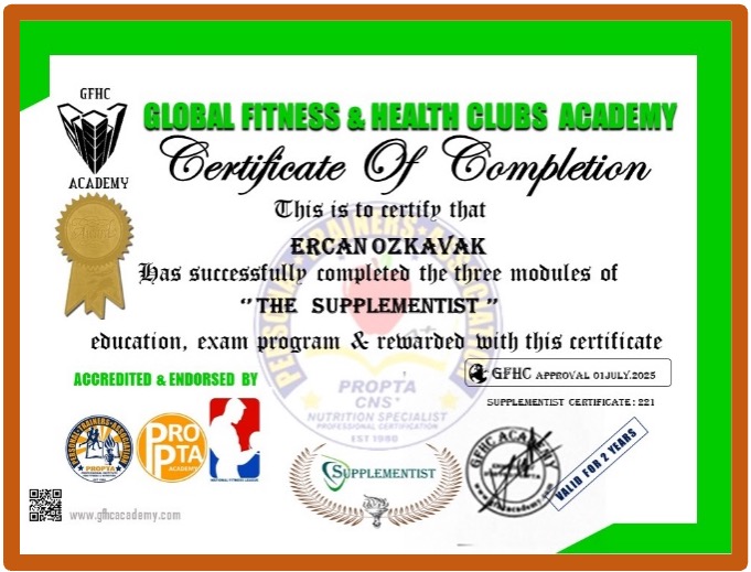 Bu eğitim; SPORTS NUTRITION / SUPPLEMENTIST / PROFESSIONAL ADVANCED NUTRITIONIST/ FACULTY OF NUTRITION DIPLOMA belgelerini içerir.